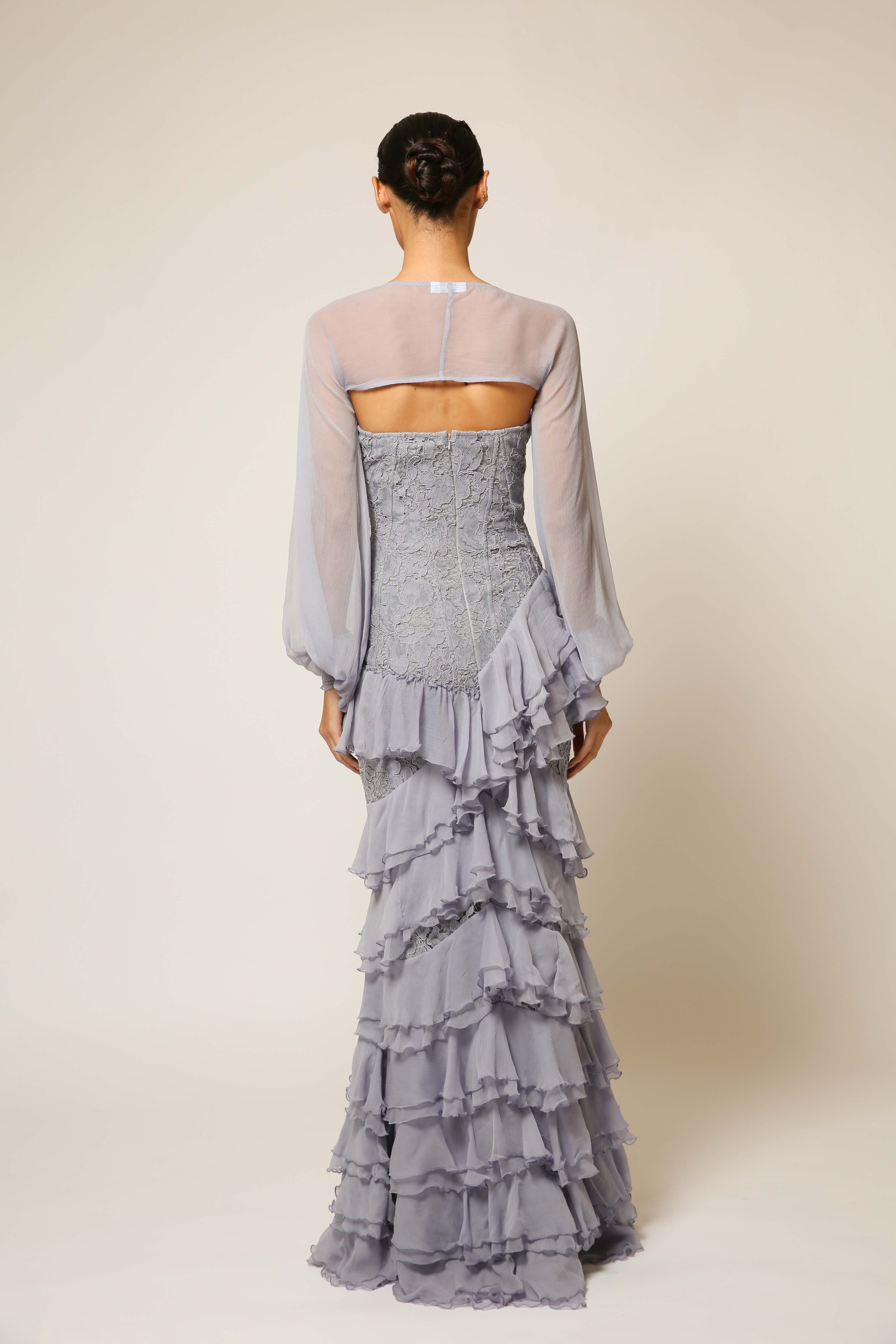 A romantic light purple gown with a structured lace body, with delicate transparent sleeves and a dramatic multi-layered ruffle skirt that flows with graceful volume and movement.