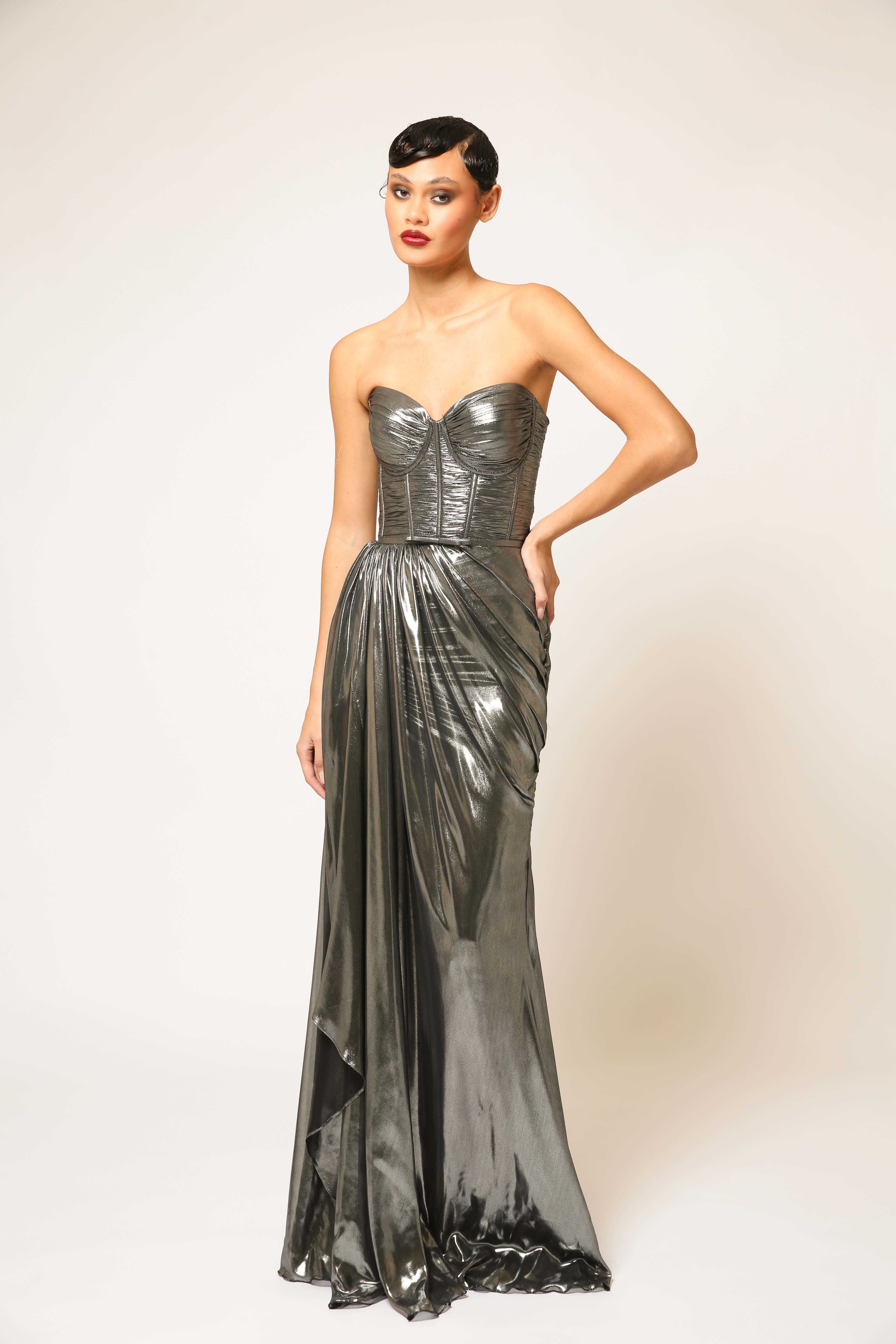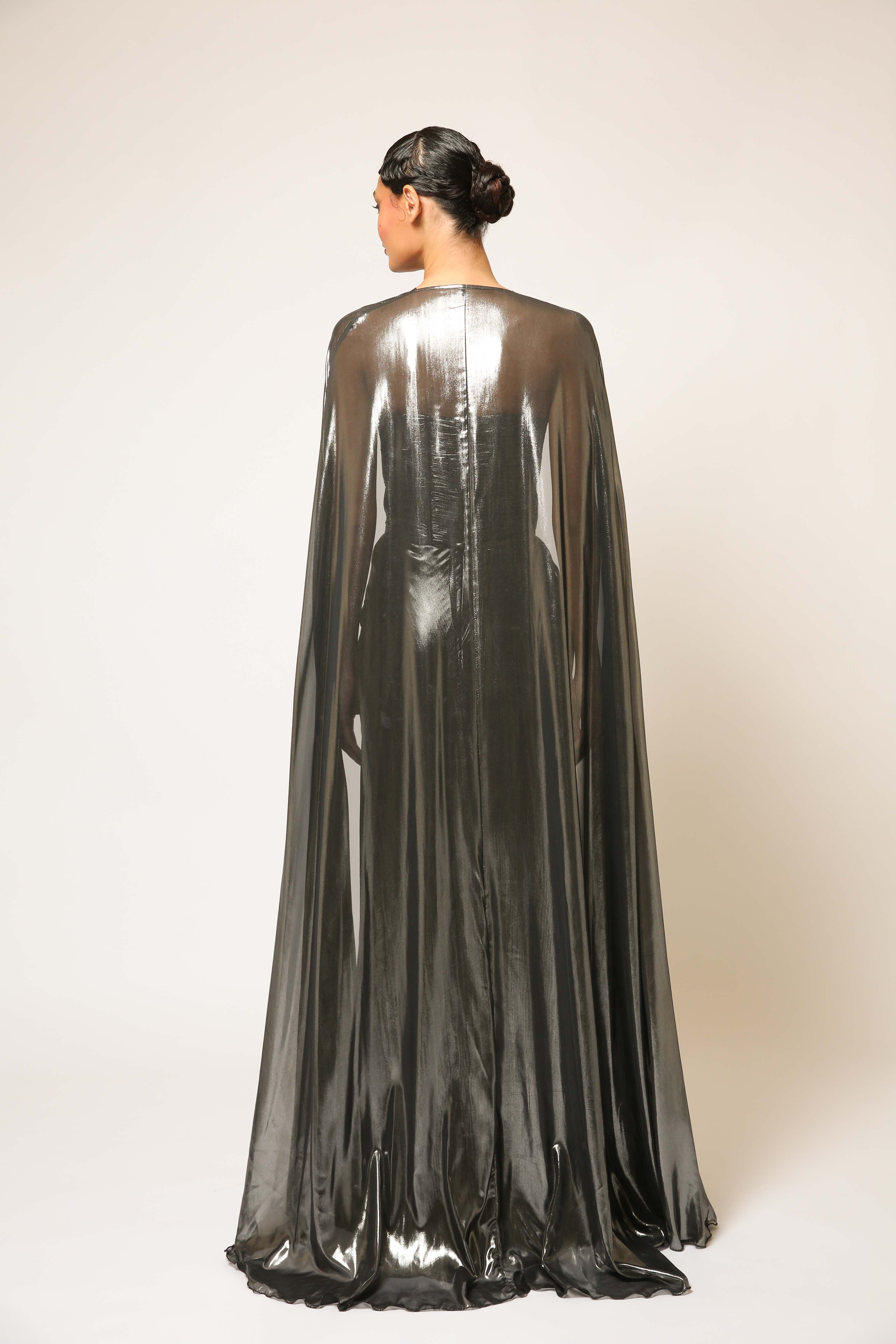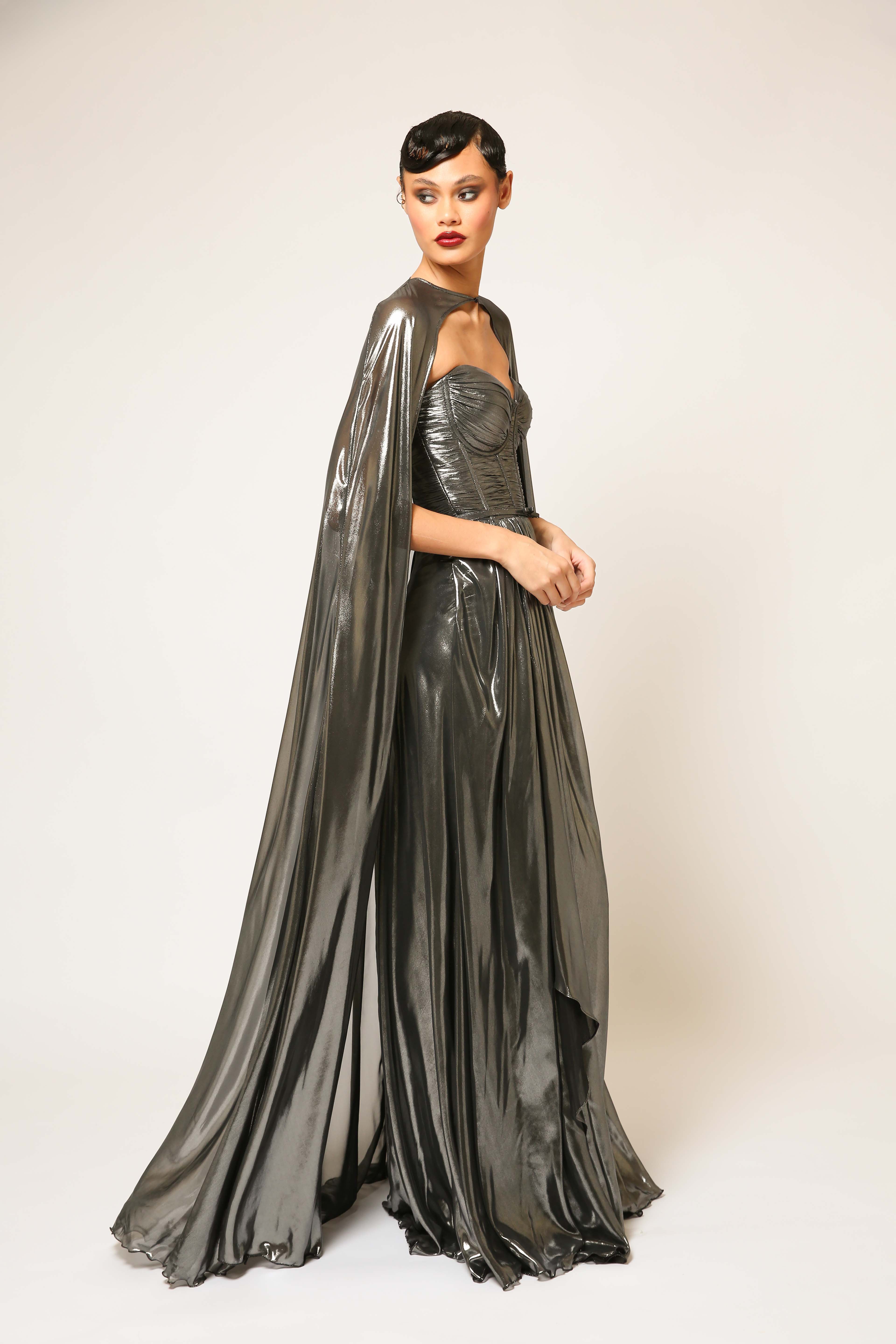 A striking silver metallic gown featuring a sculpted bodice, off-the-shoulder neckline, and a dramatic matching cape.