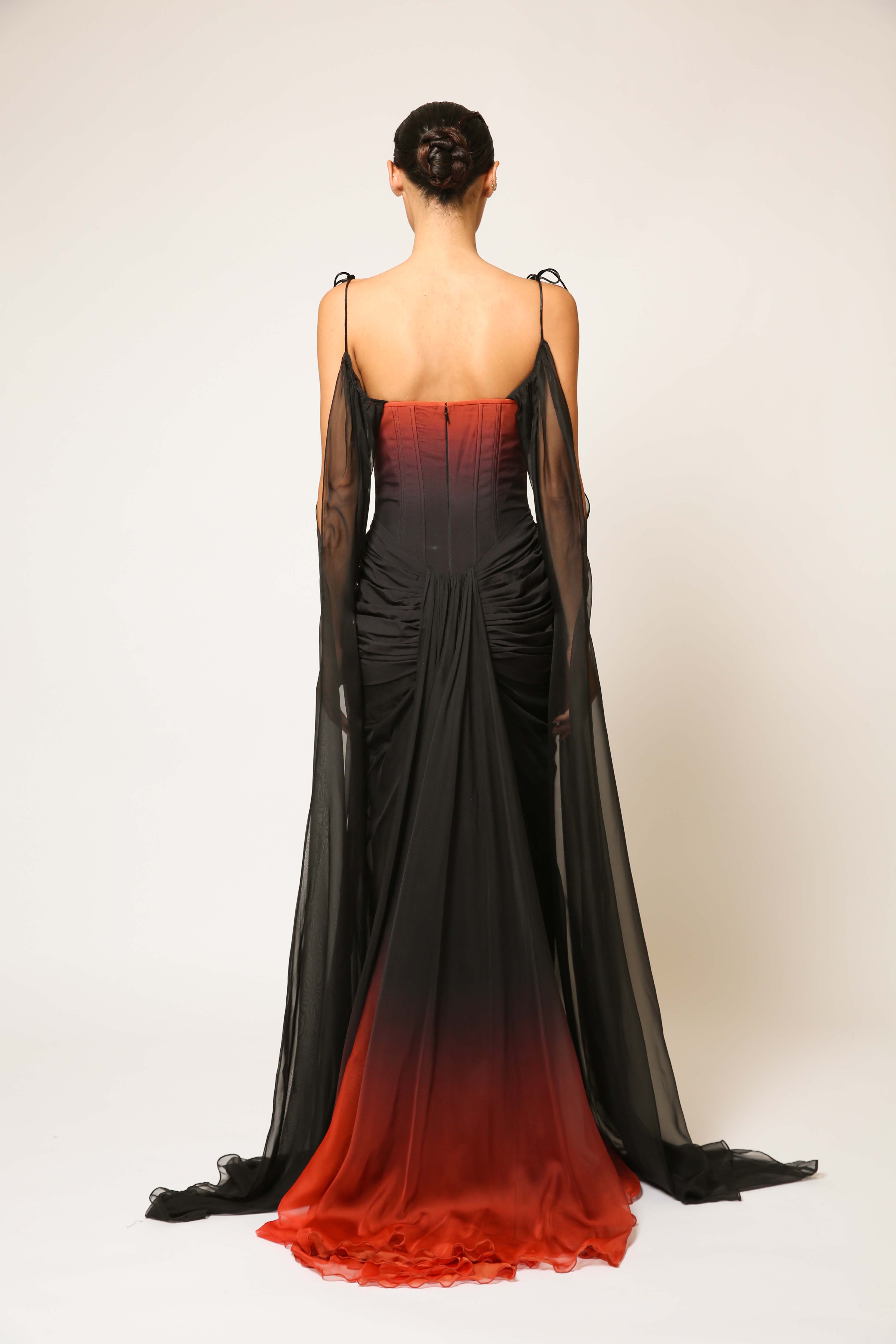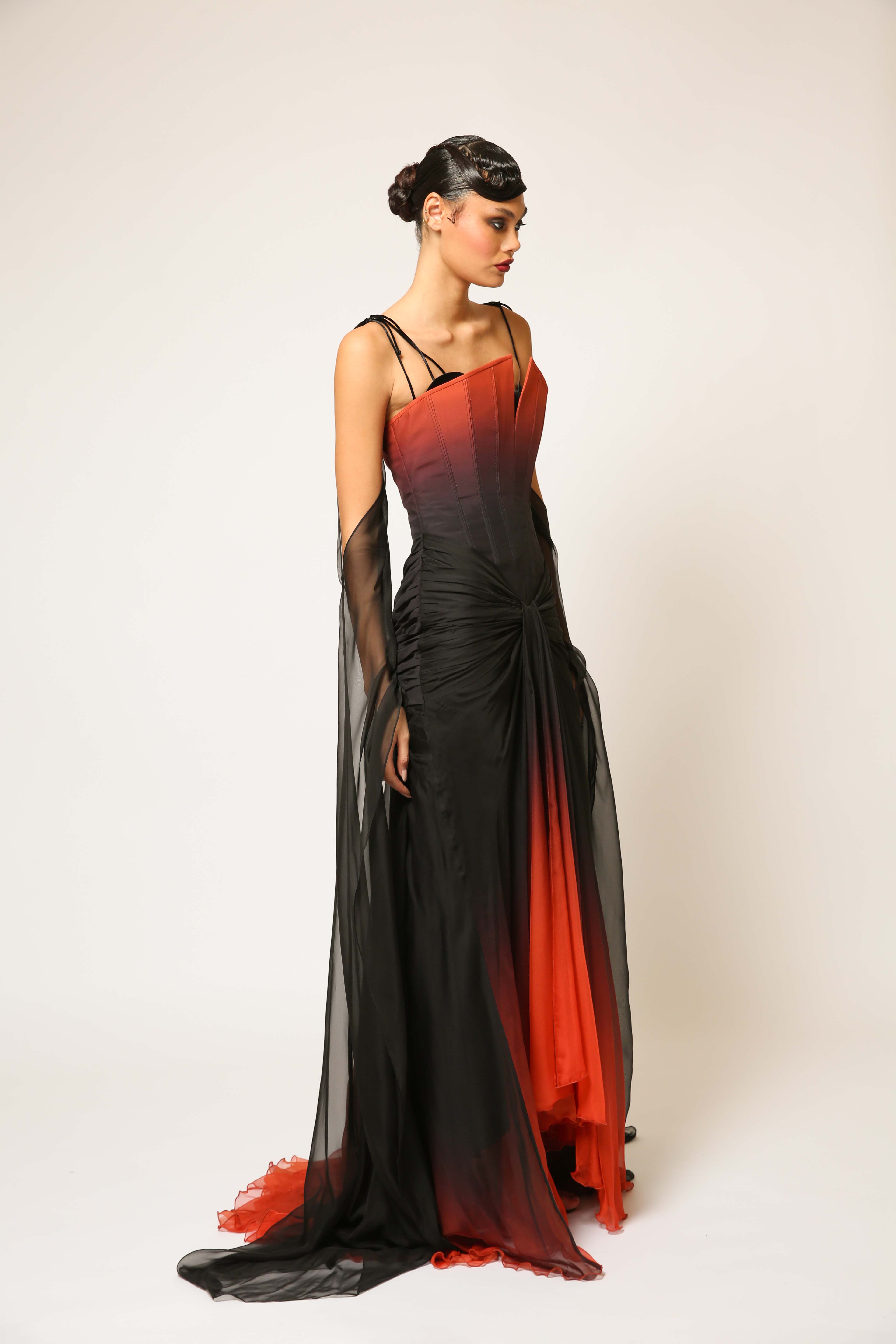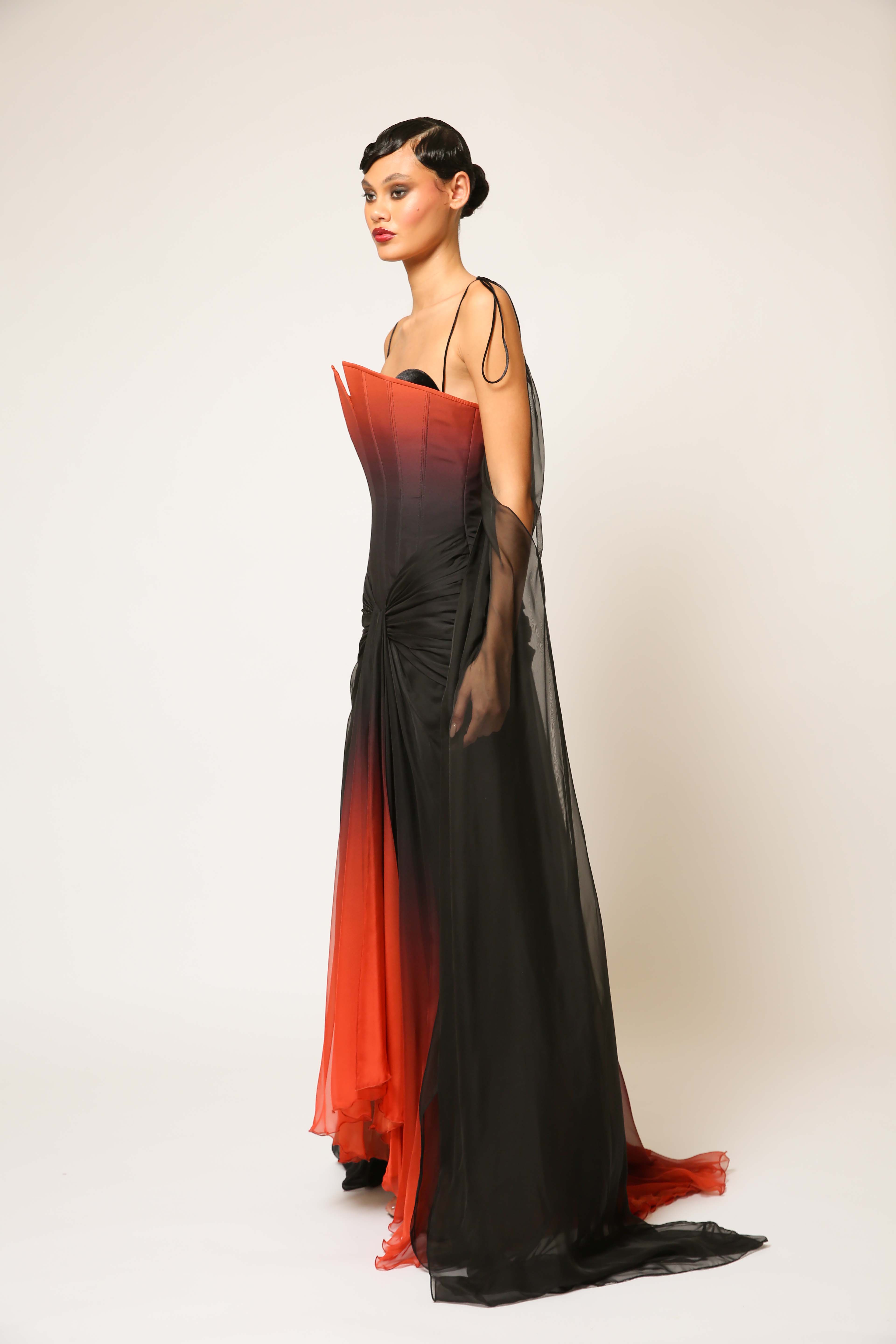 “A dramatic off-the-shoulder gown with a fire red-to-black ombre, sheer sleeves, and a sweeping train for a bold, elegant silhouette with a masterful chromatic transition.